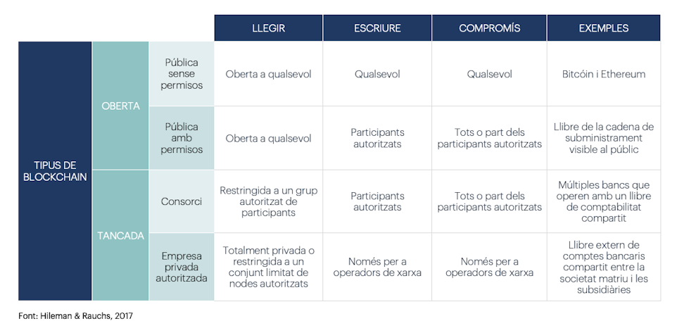 Així, segons l’accés que estableixen les comunitats d’aquests sistemes, les solucions blockchain es poden classificar en públiques, quan estan obertes al fet que qualsevol pugui llegir i veure les transaccions, com Bitcoin; i privades, si només són accessibles per un grup concret de participants acordat prèviament. I a la vegada, es divideixen en sistemes amb permisos, que permeten que només un grup selecte de participants generi transaccions i verifiqui els nous blocs a afegir a la cadena; i sense permisos, que admeten que qualsevol contribueixi i afegeixi dades lliurement.