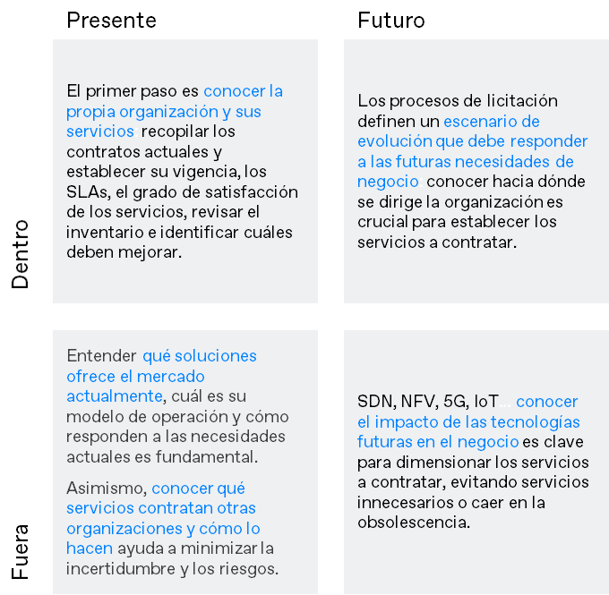 Per tant, amb la finalitat de complementar l’anàlisi interna, és molt rellevant conèixer com ha evolucionat el mercat de serveis digitals i què ofereix; és a dir, realitzar una anàlisi externa que ajudi a prendre decisions estratègiques. El coneixement del mercat dels serveis digitals, el posicionament dels operadors, els marcs de tarifes, la capacitat de gestió… són clau per determinar l’enfocament del procés de licitació. En aquest punt es fa més evident l’aportació de valor que genera comptar amb un assessorament expert que conegui bé les solucions digitals que ofereix el mercat per a cada subsegment i sector, però, segons la nostra experiència, és recomanable complementar aquest suport amb altres accions senzilles, però molt potents, com ara mantenir sessions amb els possibles proveïdors per donar-los l’oportunitat d’explicar com poden ajudar a resoldre les necessitats actuals i futures del negoci. Això, a més, genera dos efectes molt positius: donar visibilitat als proveïdors de l’inici del procés de licitació (i, per tant, facilitar-los treballar sobre l’oferta, ja que se’ls atorga més temps per preparar la seva millor proposta) i incorporar les millors solucions del mercat al disseny de la nostra solució, sense necessitat d’utilitzar el complex mecanisme de llançar una RFI (Request for Information, sol·licitud d’informació).
