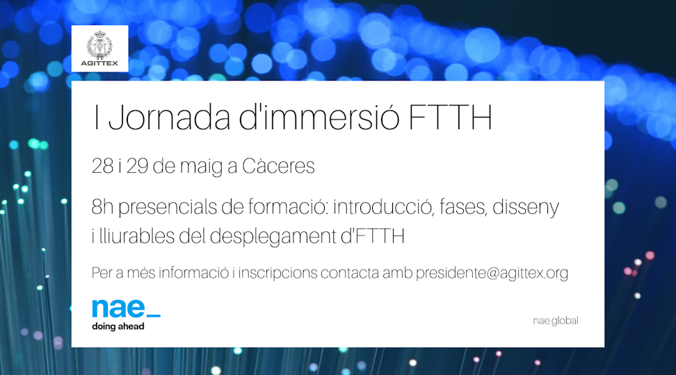 Donada aquesta rellevància, des de Nae hem decidit llançar una jornada d’immersió FTTH, en col·laboració amb Agittex, per a tot aquell que estigui interessat en la matèria i vulgui conèixer tota la vida d’un projecte d’aquest tipus.