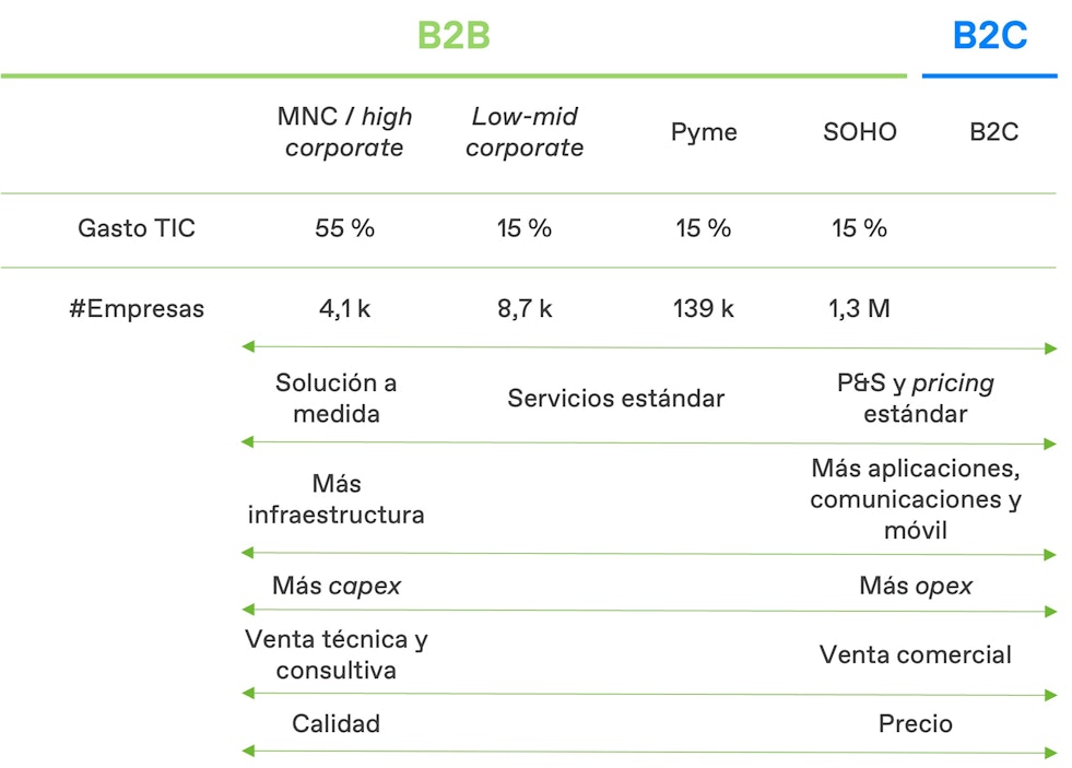 No obstant això, el B2B és molt més heterogeni. En un extrem ens trobem com a clients a autònoms i microempreses amb unes necessitats molt similars a les de residencial, però amb alguns productes i serveis complementaris. En unes certes companyies, aquests clients són fins i tot tractats des de la Unitat de Negoci Residencial a causa de la semblança en la gestió de la venda i dels canals. En l'extrem contrari, tenim a les grans corporacions, que tenen grans pressupostos TIC (tecnologies de la informació i de la comunicació) i utilitzen les tecnologies més avançades.