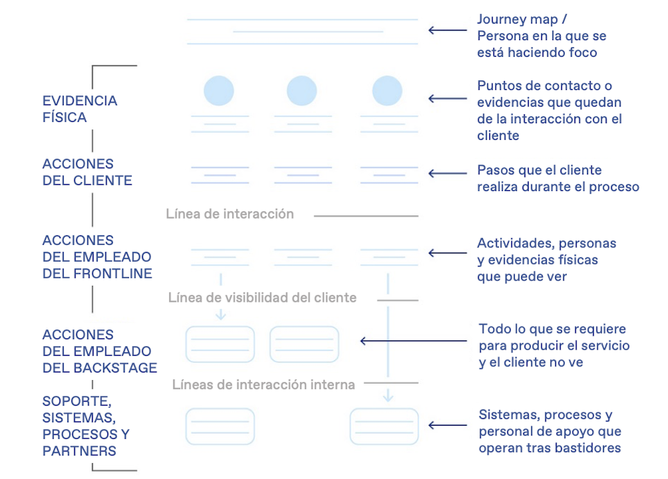 Es una herramienta de design thinking que genera diagramas que permiten definir y visualizar todos los actores que intervienen en un servicio, además de los puntos de contacto que tiene un cliente con la empresa. Es algo fundamental para diseñar los distintos procesos y llevar a cabo mejoras.