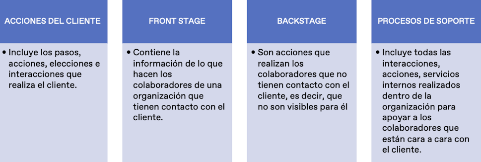El service blueprint ofrece una visualización de las acciones del cliente, la parte front stage (las interacciones del usuario con la organización), el backstage (lo que hay detrás de los servicios) y los procesos de soporte con los que el consumidor no tiene contacto.